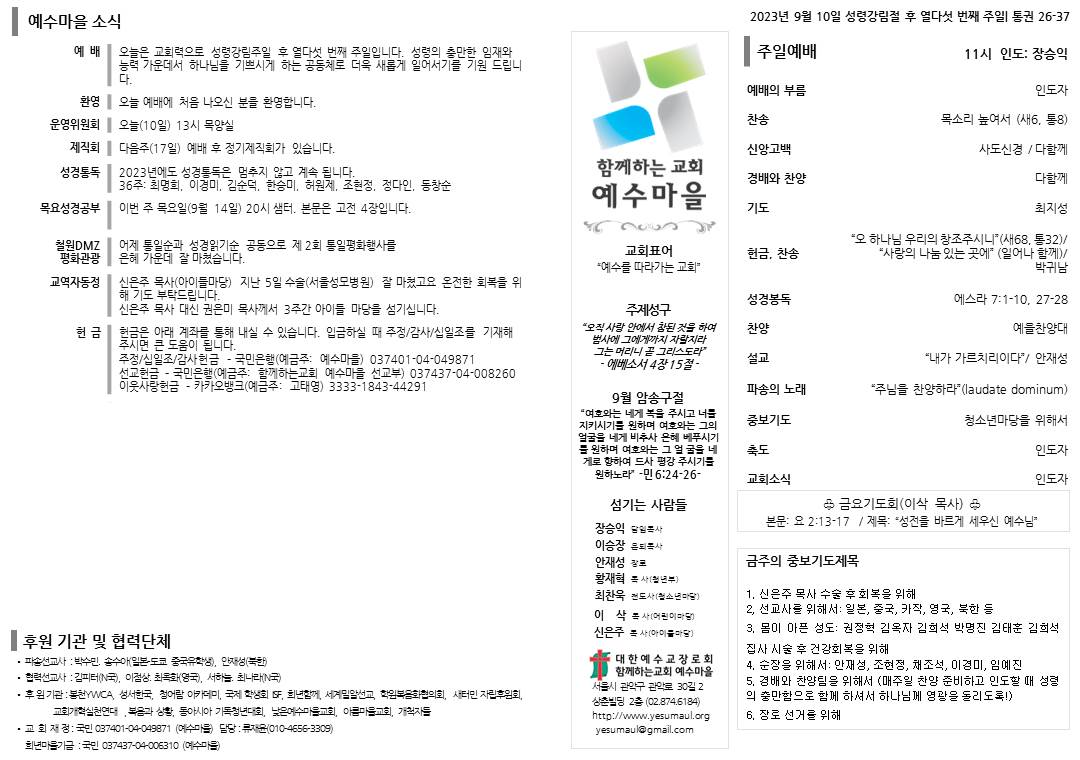 | 23년 9월 17일 주일예배 일반부 주보 (0) | 2023.09.20 |