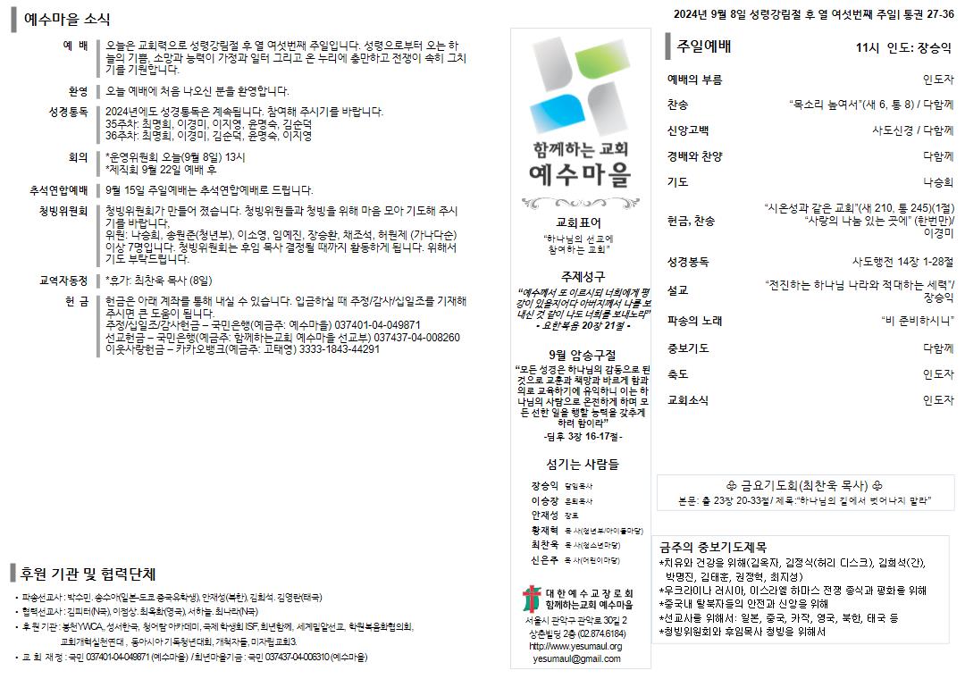 | 24년 9월 15일 주일예배 일반부 주보 (0) | 2024.09.15 |
