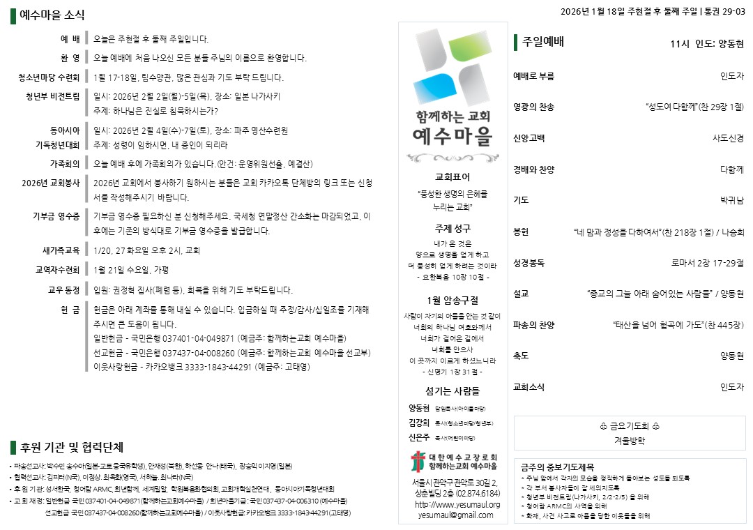 | 2026년 1월 25일 주일예배 일반부 주보 (0) | 2026.01.27 |