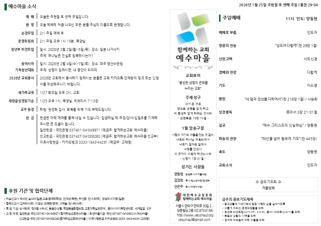 | 2026년 2월 1일 주일예배 일반부 주보 (0) | 2026.02.01 |
